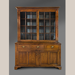 A very similar but larger cupboard (Figure 83) has an equally strong history that supports John Swisegood as its maker. The cupboard has two arched upper doors instead of one and flanking applied pilasters. Because of the extra shelf width, the double beaded upper shelves have two concave sections on the front rather than one (Figure 84). Reflecting the slightly later date of the cupboard, the pilasters here are topped with flat, rectangular caps (Figure 85), rather than the earlier mushroom-shaped caps. In this instance the bases and caps mirror one another exactly. The cupboard also has original oval pulls (Figure 86).