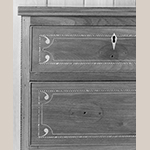 This chest of drawers has all the same characteristics found on the Mordecai Collins desk (Fig. 40), with a few notable distinctions. The drawer-front cross banding is figured cherry instead of walnut, but like the walnut banding on the desk in Fig. 40, the corners have been mitered. This piece also has comma-shaped light-wood inlay (Figure 50) traditionally associated with the Swisegood school (the same shape also found on several of the pierced gravestones; see Figs. 5, 7, 11, 13, 15 and 18). Its original oval pulls are identical to those found on other examples in the school that retain their original hardware (Figure 51). A construction technique found here and used on almost all of the chests of drawers in the school is a top of two solid layers screwed together from the bottom up (Figure 52).