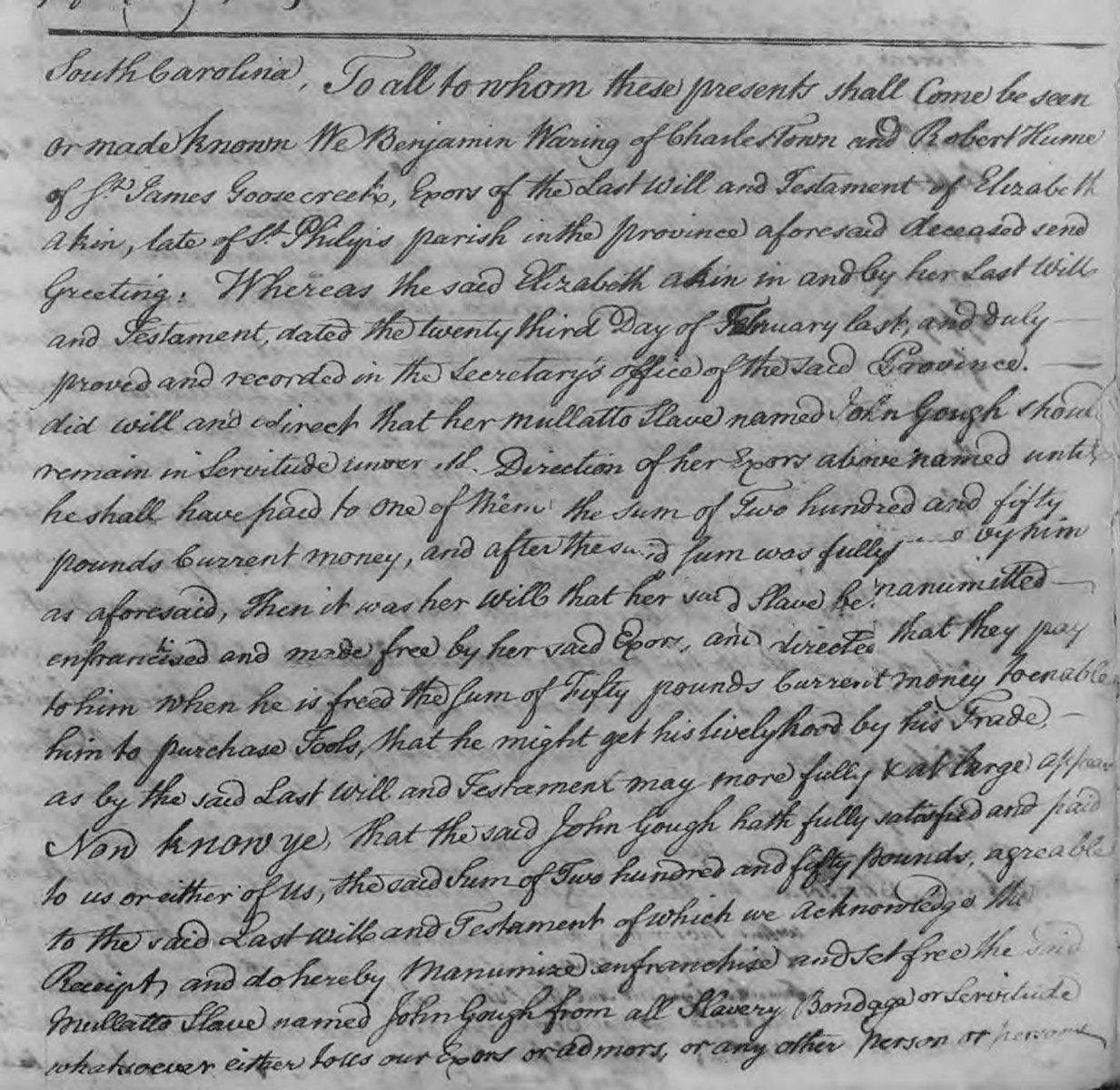 Now know ye, that the said John Gough hath fully satisfied and paid to us or either of us, the said Sum of Two hundred and fifty pounds, agreeable to the said Last will and Testament which we acknowledge the receipt, and do hereby Manumize enfranchise and set free the said Mulatto Slave named John Gough from all Slavery Bondage or Servitude whatsoever… .”[17]