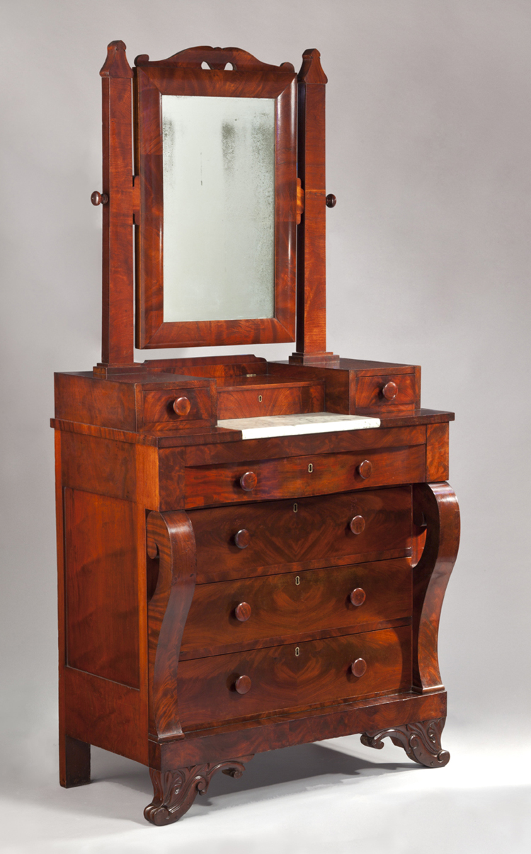 [37] For an example of Thomas Day’s furniture, see an 1850 dressing bureau in the MESDA collection (Acc. 5399), online: https://mesda.org/item/collections/dressing-bureau/20016/ (accessed 8 August 2020). For an outstanding analysis of John Hemmings’s work at Monticello and an attributed table he made for Poplar Forest, see Robert Self, “ ‘I Have a Job of 4. Pembroke Tables on Hand at Monticello’: Five Tables Made for Thomas Jefferson’s Poplar Forest by Joiners James Dinsmore and John Hemmings,” MESDA Journal, 2020, Vol. 41, online: https://www.mesdajournal.org/2020/i-have-a-job-of-4-pembroke-tables-on-hand-at-monticello-five-tables-made-for-thomas-jeffersons-poplar-forest-by-joiners-james-dinsmore-and-john-hemmings/ (accessed 8 August 2020).