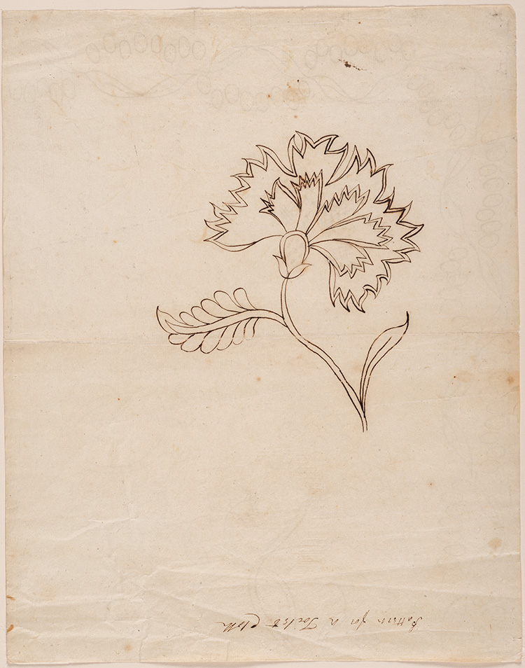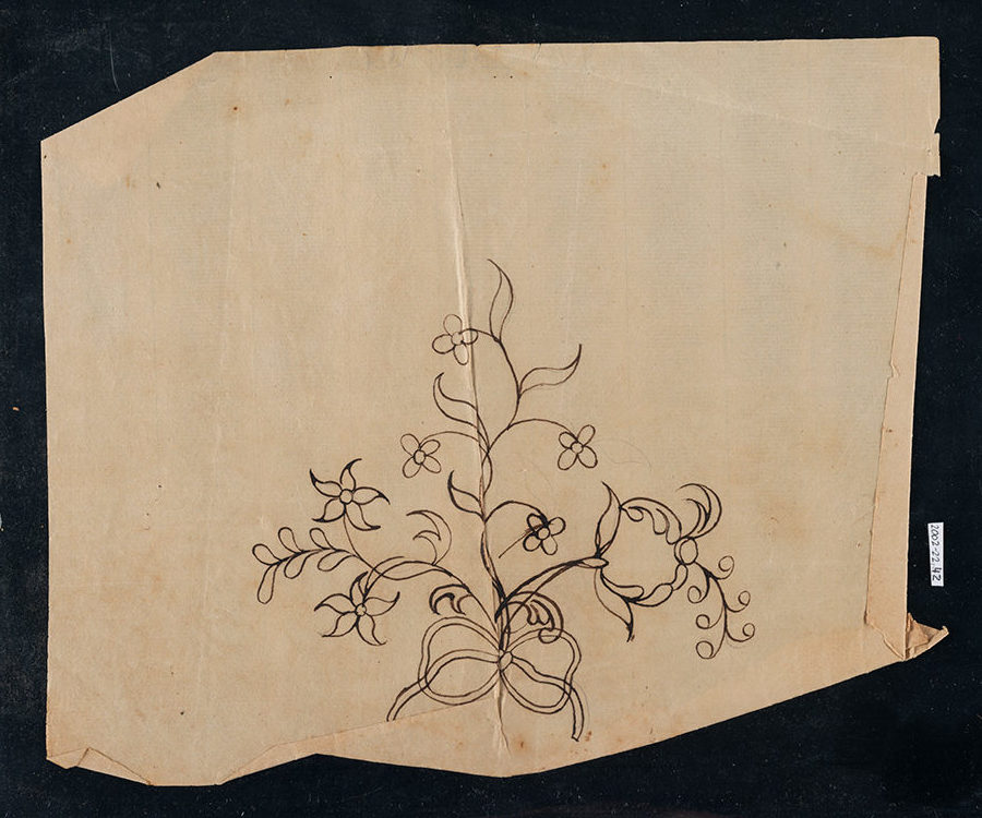 The majority of these patterns are individually cut floral sprigs that could be arranged into an endless variety of garlands and bouquets. Several large uncut patterns were likely intended to adorn the bottom of a petticoat or the edge of a coverlet; however, it is unclear how Jean used the other patterns that she drew. Except for two unadorned cotton pockets, no extant textile objects can be attributed to Jean or her daughters.[4] However, a profusion of pinholes indicates that many of the patterns were pinned to fabric, some multiple times over. These may have been used to adorn items of dress or fashionable accessories, such as handkerchiefs, workbags, or reticules. Several pattern pieces (Figure 4) retain evidence of pouncing, whereby small holes in the pattern allowed a loose powder such as charcoal to penetrate the pattern and transfer the outline onto the surface beneath. Many of the pinholes are dotted with ink, indicating that whoever used these patterns transferred the designs onto fabric with the help of an inked quill.