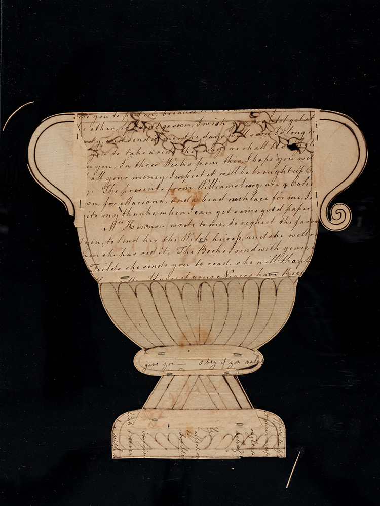 While none of the patterns are signed, several are cut from letters and manuscripts that were either written in Jean’s hand or refer to life at Prestwould. One pattern is cut from a list of books “to be got by Mr Cunningham” (Figure 1). This list appears to be written in Jean’s hand and likely refers to William Cunningham, who worked as her agent.[3] Her characteristic handwriting appears on another pattern “for a Toilet Cloth” (Figure 2). A large pattern in the shape of an urn (Figure 3) is cut from a letter that refers to “presents from Williamsburg,” including a “bead necklace.” Yet another pattern is cut from a letter addressed to an unknown recipient at Prestwould.