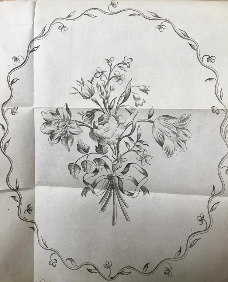 Jean’s botanical notes are characterized by scientific precision. By contrast, her needlework patterns privilege aesthetics over botanical verisimilitude. Although it is possible that Jean drew inspiration from the natural world, her patterns closely resemble those published in periodicals during the late eighteenth century.[7] An uncut floral bouquet adorned with a large bow (Figure 5) loosely resembles a pattern that was originally published in the August 1782 issue of The Lady’s Magazine (Figure 6) and the November 1782 issue of The Hibernian Magazine.[8] This pattern circulated through multiple southern households during the late eighteenth century and even appears in a 1789 portrait of Mary Harvey and Sarah Champneys of Charleston, South Carolina (Figure 7). A printed pattern “for a Lady’s Work-Bag” (Figure 8) provides more concrete evidence that Jean drew inspiration from contemporary publications. This pattern closely resembles one that was published in the November 1779 issue of The Lady’s Magazine; it is possible that it was published by a competing publication that made small alterations to claim ownership over the design.[9]